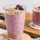 Crunchy granola blended with mixed berries for a wholesome and energizing smoothie by Hey Salad.