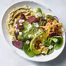Creamy beetroot hummus served with avocado and fresh greens for a nutritious, flavour-rich combination by Hey Salad.