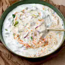 Creamy curd mixed with soft rice and tempered with mustard seeds, curry leaves, and green chillies for a refreshing, comforting bowl by Oye Hoye Parathas.